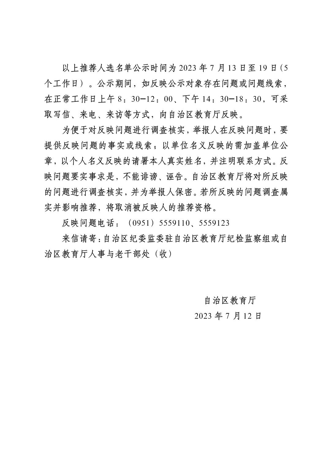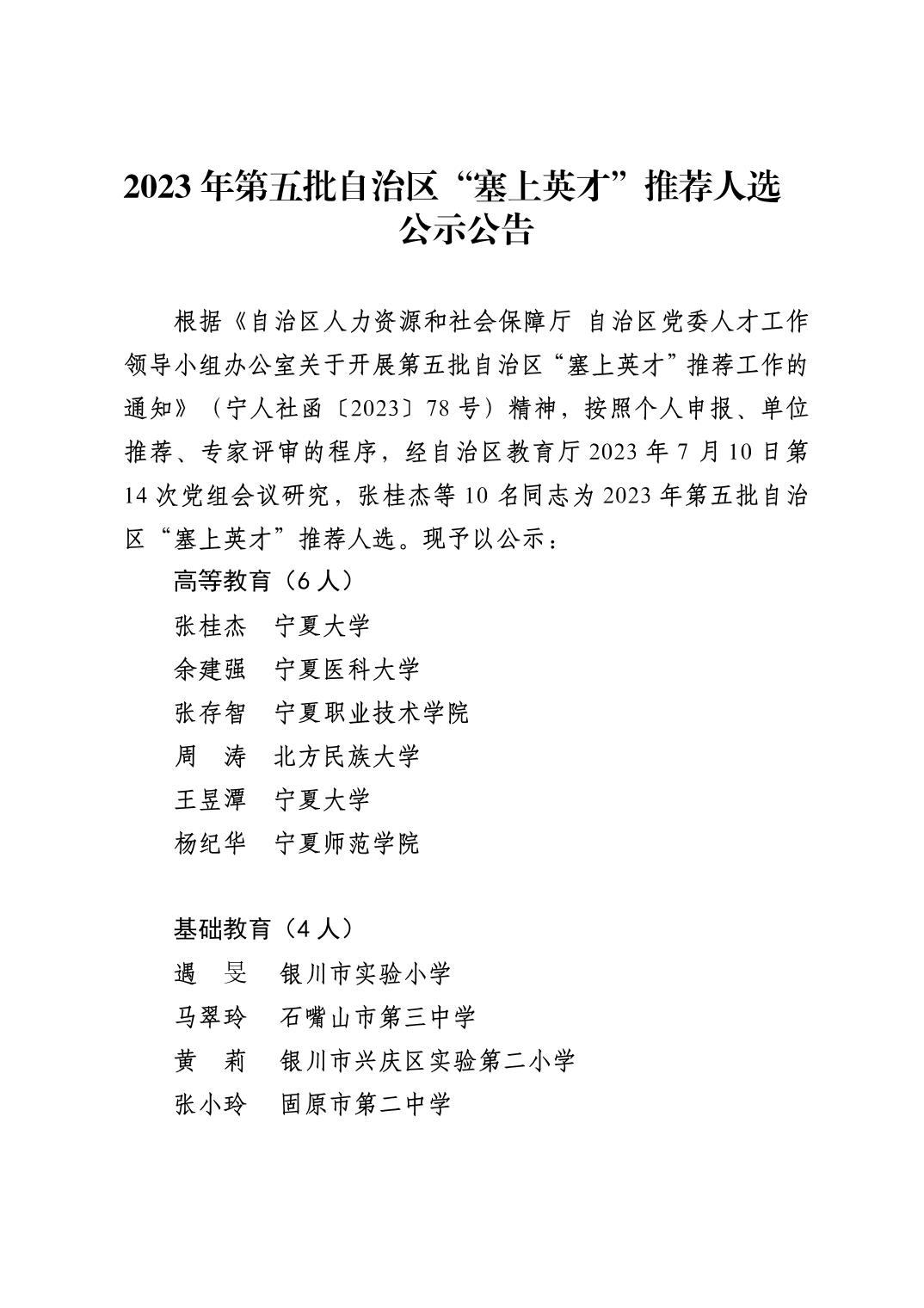 2023 年第五批自治区“塞上英才”推荐人选公示公告