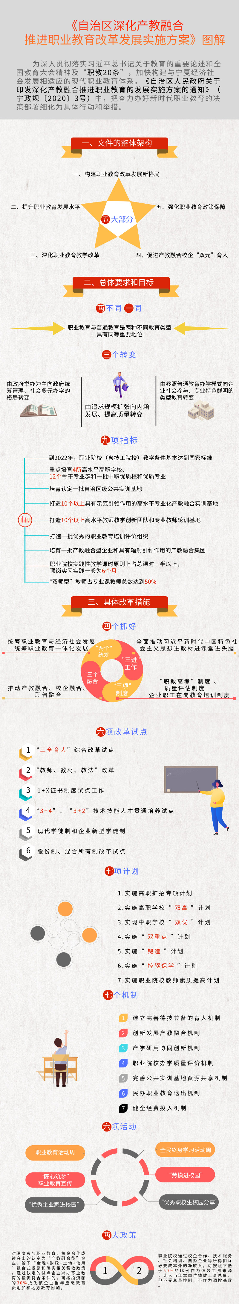《实施方案》主要包括5部分20条举措:前言指导思想和目标要求着重明确办好新时代职业教育,要以习近平新时代中国特色社会主义思想为指导,完善职业教育和培训体系,推进办学体制和育人机制改革,深化产教融合、校企合作,培养高素质劳动者和技术技能人才。